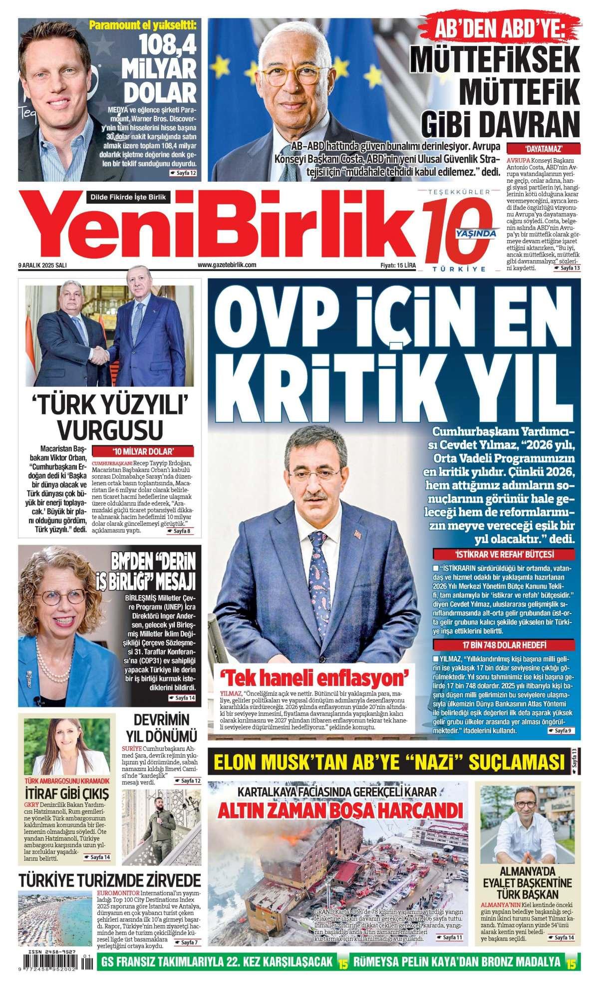 Yeni Birlik Gazetesi 10 Aralık 2025 Günü Manşeti